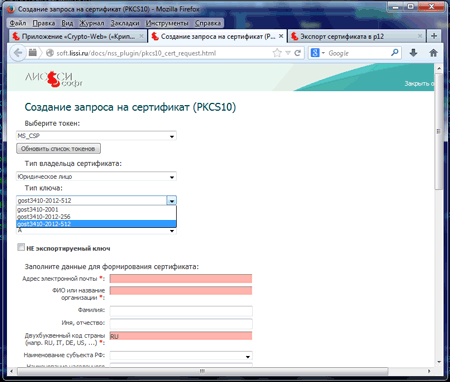 Теперь пользователи плагина LCSignPlugin могут создавать запросы на сертификат, включая генерацию  ключевых пар как по ГОСТ Р 34.10-2001, так и по ГОСТ Р 34.10-2012 с длиной открытого (публичного) ключа как 512, так и 1024 бита, не только на устройствах PKCS#11, но и в MS CSP (например, КриптоПро CSP 4.0):