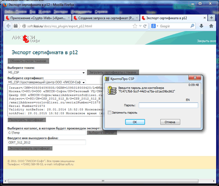 Новый функционал плагина LCSignPlugin позволяет также экспортировать личные сертификаты ключей проверки электронной подписи как по ГОСТ З 34.10-2001, так и ГОСТ Р 34.10-2012, из  хранилищах MS CSP в защищенные контейнеры PKCS#12: