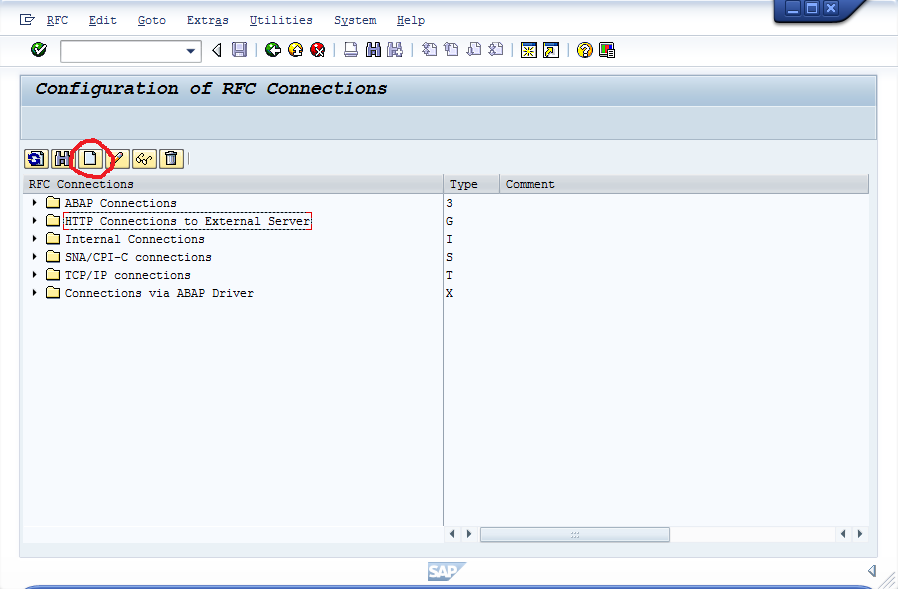В транзакции SM59 можно создавать и тестировать соединения различных типов. Например, можно организовать доступ к личному кабинету на сайте Федеральной налоговой службы РФ. Для этого следует нажать кнопку «Create» в главном окне транзакции: